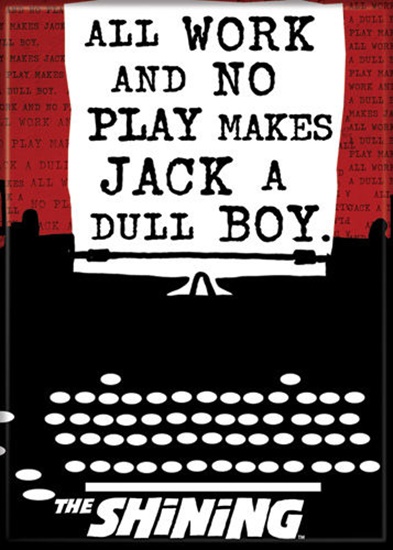 At one point, Jack’s wife (Shelley Duvall) looks at what her husband has been writing on the typewriter, and finds he has just been typing All work and no play makes Jack a dull boy over and over, filling hundreds of sheets of paper in the process. (The phrase is a traditional English proverb about work-life balance).