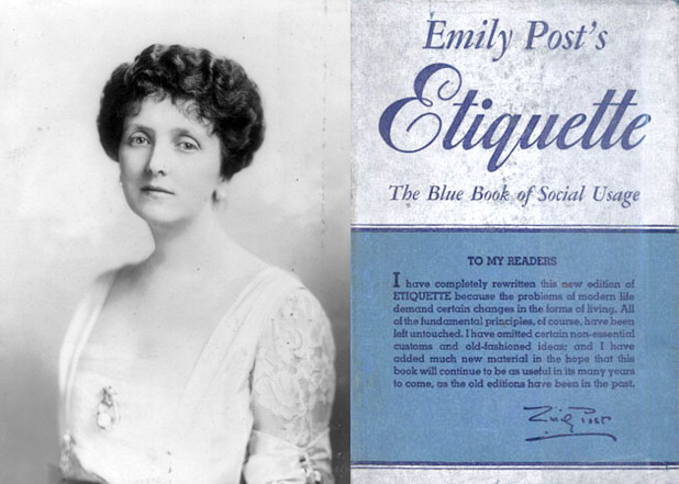 Emily Post (1872-1960) was a famous expert on etiquette. Her 1922 book Etiquette in Society, in Business, in Politics and at Home became an instant best-seller, was popular for decades, and made her name. She went on to write newspaper columns on etiquette, and founded the Emily Post Institute in 1946, which carries on her work.
