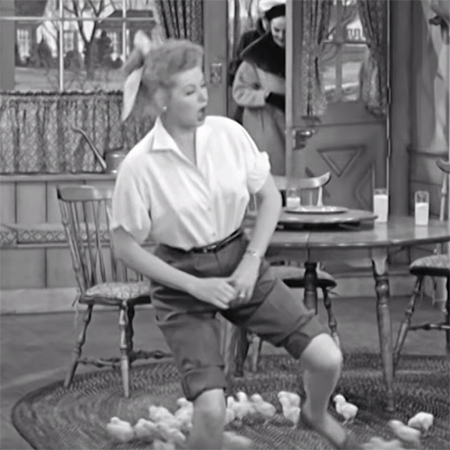 On I Love Lucy, earlier discussed, there was a point in the show when New Yorkers Lucy and Ricky Ricardo began a new life in Connecticut. In the episode Lucy Raises Chickens (4 March 1957), Lucy tries to make money to pay the bills by raising five hundred chickens in the house, and attempts this method of bonding with them.