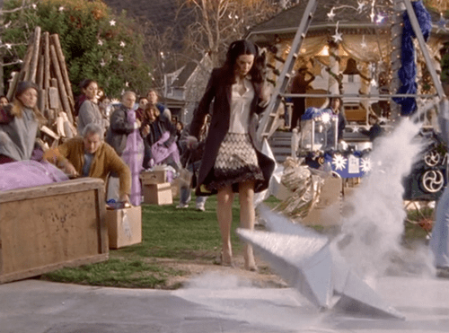 While Lorelai is walking grumpily through the preparations for the Founder’s Firelight Festival, a papier mache star accidentally falls right in front of her, almost hitting her. It’s an apparent sign that the stars above don’t approve of her love-lorn depression which is out of step with the festival and the community, or else they are trying to send her a very strong signal to do something about it. Maybe both.