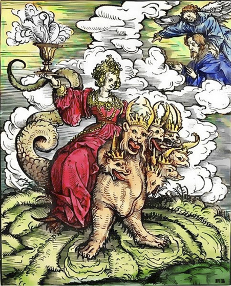 This “great whore” is described as lavishly dressed, drinking the blood of saints and martyrs in a jewelled cup, and sitting on a scarlet beast of blasphemy, with seven heads and ten horns. Revelations explains that the seven heads mean seven mountains and seven kings, while the ten horns are ten further kings who will receive power for a short time, while the woman stands for a great city which reigns over the kings of the earth.