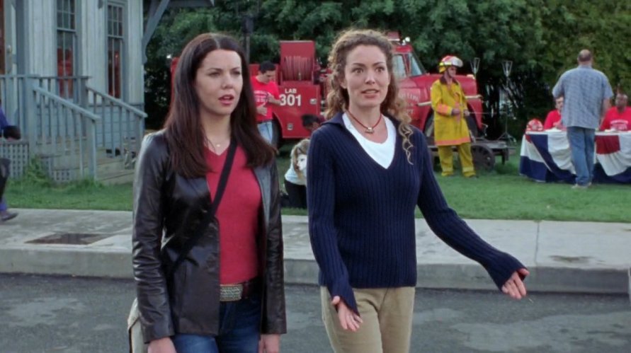 Notice that in the background the Stars Hollow Fire Department is holding a fundraiser – a sign that problems have reached emergency levels in Rachel and Luke’s relationship. Lorelai is wearing red to match the fire engines, showing the source of the emergency.
