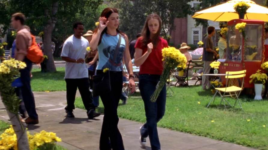 (You can see in the background that Lorelai has donated her yellow daisies to the entire town, and they even seem to have set up a little red wagon in the town square from which to either sell or give away the flowers to passers-by. It’s a typically big-hearted gesture by Lorelai which serves to make her more of a star and the centre of attention. It’s also practical, as she could hardly take all the daisies home).