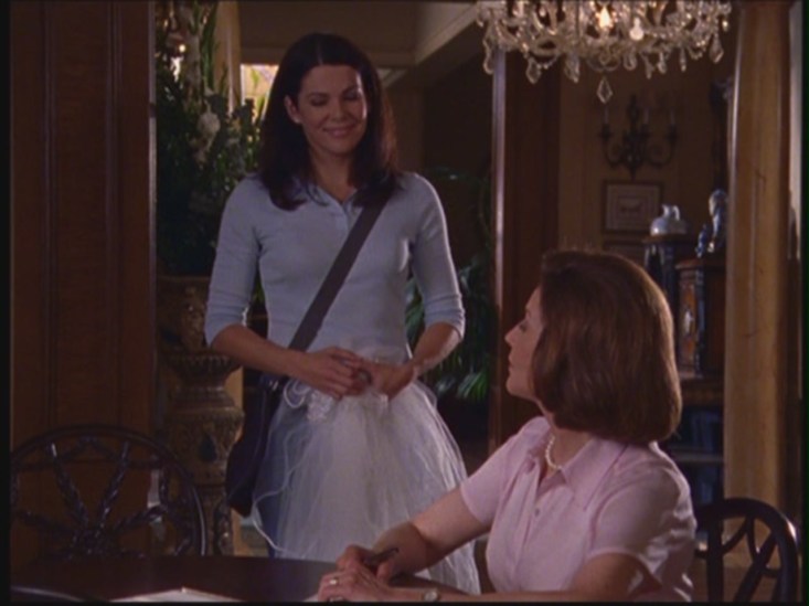 Emily suggests a tiara instead, and says that’s what she wore as a bride, perhaps indicating that she also thinks of her own head as “too big”, and may be projecting that onto Lorelai. While neither Emily nor Lorelai have enormous heads, they both would look good in a tiara, so Emily’s taste may simply be correct.