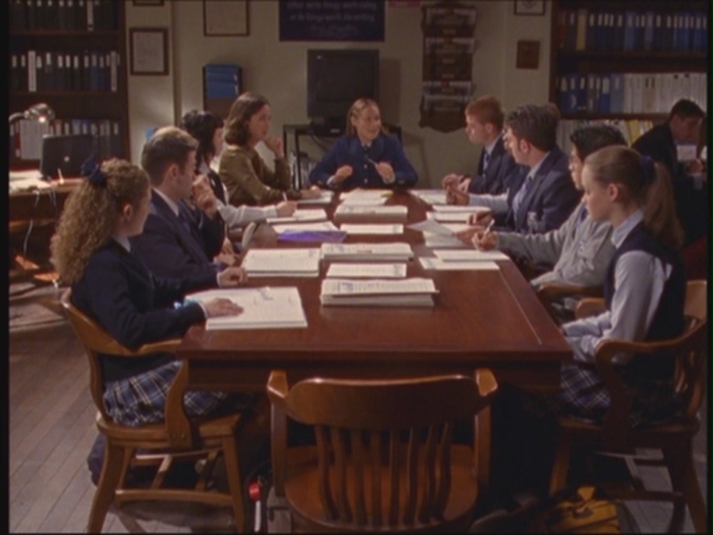 Paris has been chosen as the editor, and plans to use her position to make Rory’s life miserable. She tells Rory the meeting is at 4 pm, but it actually began at 3:15 pm, so that Rory arrives very late (a handy writing technique, so that we don’t see all the boring part of a meeting where everyone introduces themselves and the teacher makes a welcoming speech).