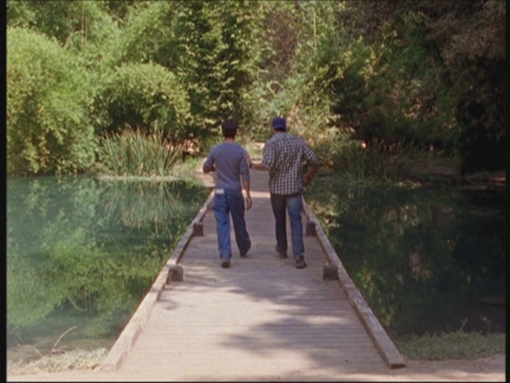 Luke waits for Jess after school, then as they walk home, confronts Jess about taking money from the donation cup for the bridge repair fund at Doose’s Market. Jess tells Luke to leave him alone, and in frustration, Luke pushes Jess off a low bridge (more of a walkway) into a lake. It’s the #1 fan favourite scene in this episode, with good reason.