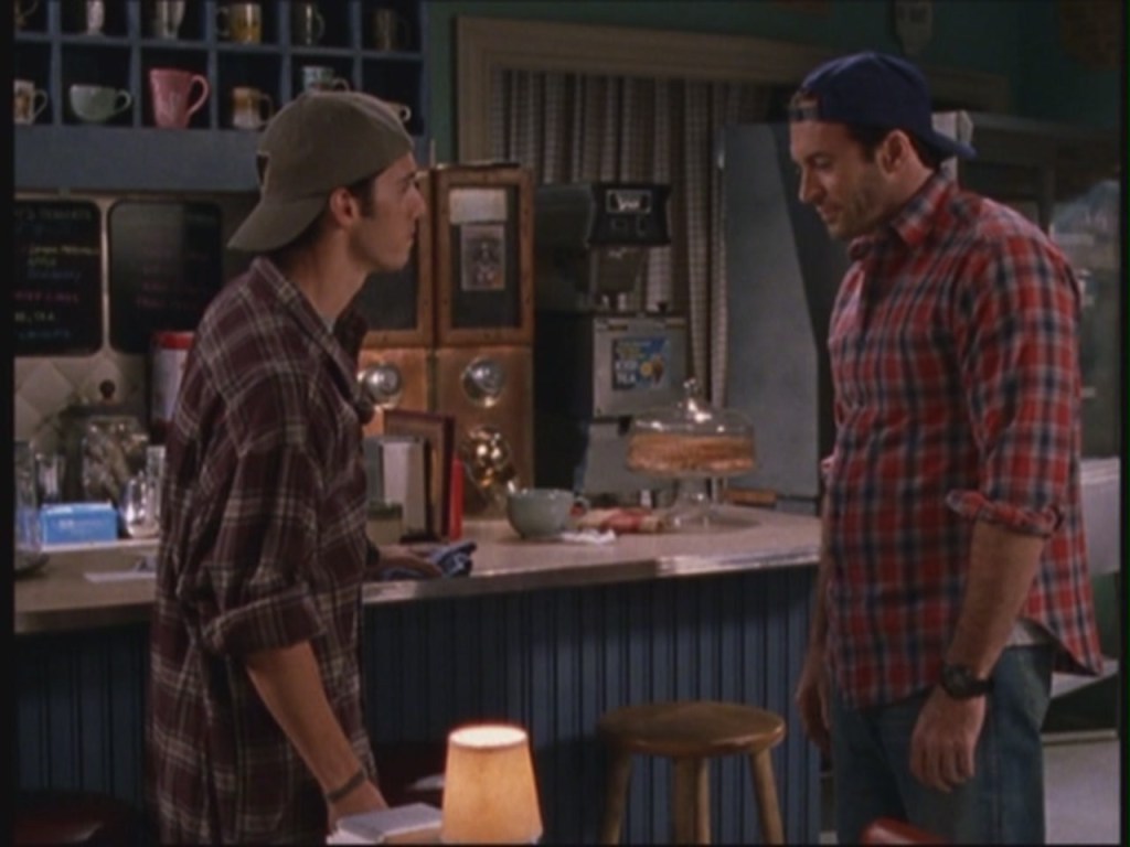 A bookends-style joke for the episode. At the beginning, Jess was in trouble for wearing his “inappropriate” Metallica tee-shirt to work at the diner. Now he comes out dressed as a Luke clone, in his own checked flannel shirt and backwards baseball cap, claiming he assumed that it was the uniform for the job.
