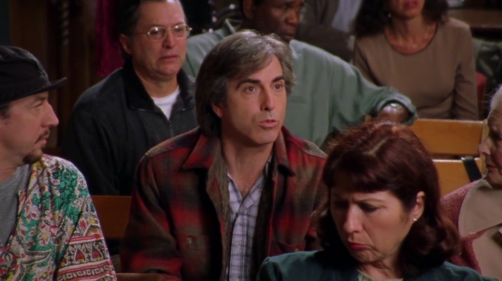 Andrew from Stars Hollow Books is at the meeting, and says that his son told him about Jess setting off the fire alarms at the high school. We now discover that Andrew is the father of a boy, presumably a teenager. (He makes it sound as if he only has one son, although there may be daughters as well). He’s sitting next to Bootsy, as if they might be friends (or both in the trade of selling reading materials, so have something in common).