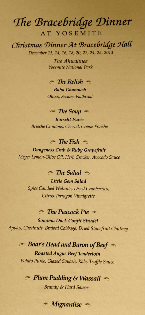 The Bracebridge Dinner at the Ahwahnee Hotel serves modern gourmet food, but with a slight nod to the Renaissance in how it is labelled. Sookie’s menu seems to resemble it very closely.