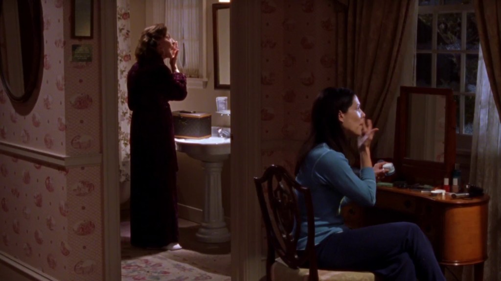 An amusing “like mother like daughter” shot of Emily and Lorelai simultaneously going through their nightly skin care routines, showing that Emily and Lorelai really were alike in many ways.
