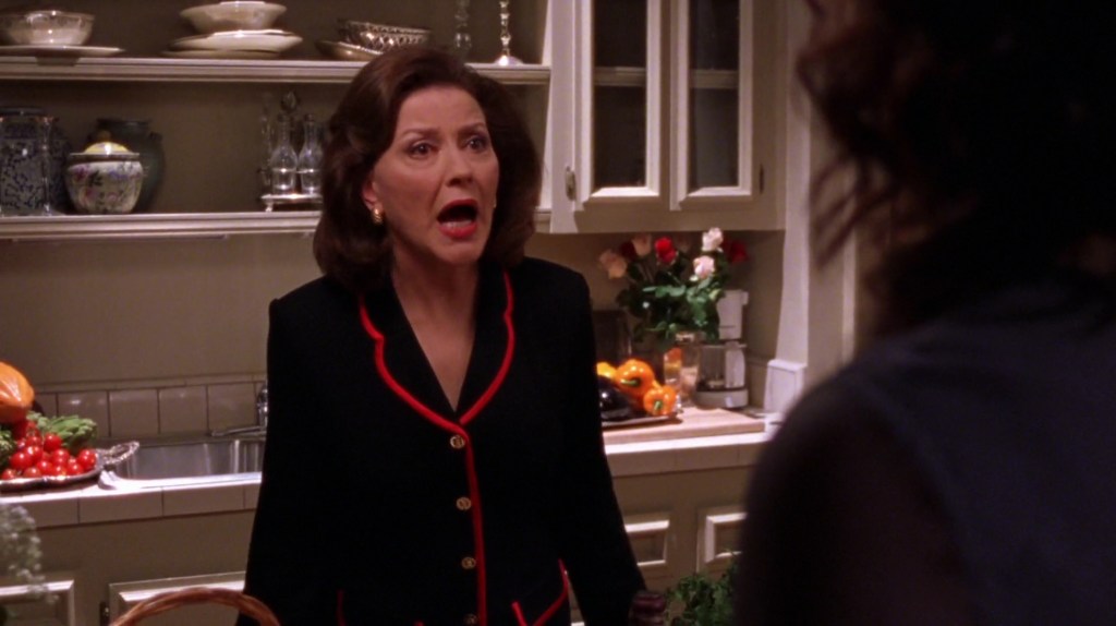 The episode’s title comes from Emily’s outburst to Lorelai, that, “It should’ve been you!”. Note that Emily’s outfit is mostly sad black, with touches of angry red. Lorelai is in grey, trying to remain neutral.