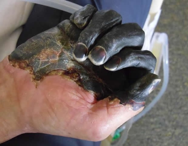Gangrene is when the tissues of the body die due to lack of blood supply, most commonly on the feet and hands. The skin changes from red to black, accompanied by numbness, swelling, pain and skin breakdown. If caused by an infection, it may include fever or blood poisoning. Although there are numerous possible causes, diabetes and smoking are the most common culprits in “dry gangrene”. “Wet gangrene” is caused by bacteria, and the flesh rapidly becomes putrid and rotting. About 80% of people will die without treatment (20% with treatment), and amputation is usually necessary.