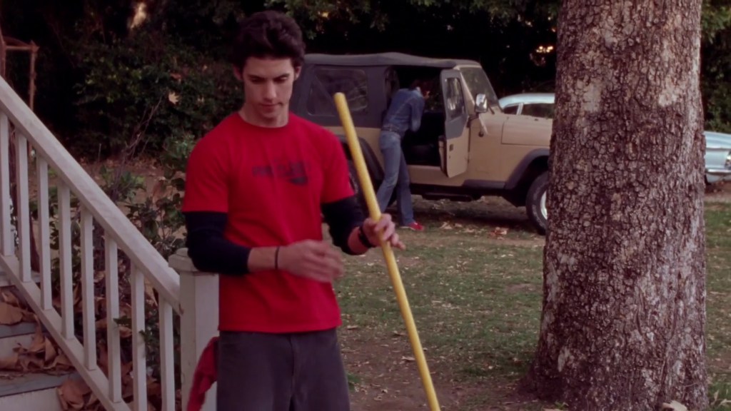 While Lorelai checks the car to see if the bracelet is there, we see Jess outside, staring at the bracelet with a look of unhappy disillusionment. All this time he has been cherishing it as a memento of Rory, something which has actually touched her skin. He must feel such a fool when he discovers he’s been unwittingly sighing over something Dean made for her, and probably concerned when he realises that losing it has upset Rory and caused her to worry about Dean’s reaction.