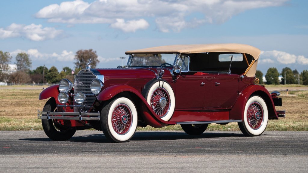 The car that Richard has bought to work on is a 1929 Packard Deluxe Eight Dual Cowl Sport Phaeton (type 640), a convertible sedan in a deep dark red colour. The Series Eight sedan was Packard’s best-selling model for many years, making Packard the best-selling luxury car maker, selling twice as many cars overseas as any other in its high price range; it was the number one designer and manufacturer of luxury vehicles from the turn of the twentieth century until World War II. Note the “Flying Goddess” hood ornament, this style used on Packard cars in the mid to late 1920s is considered a rare find in itself.