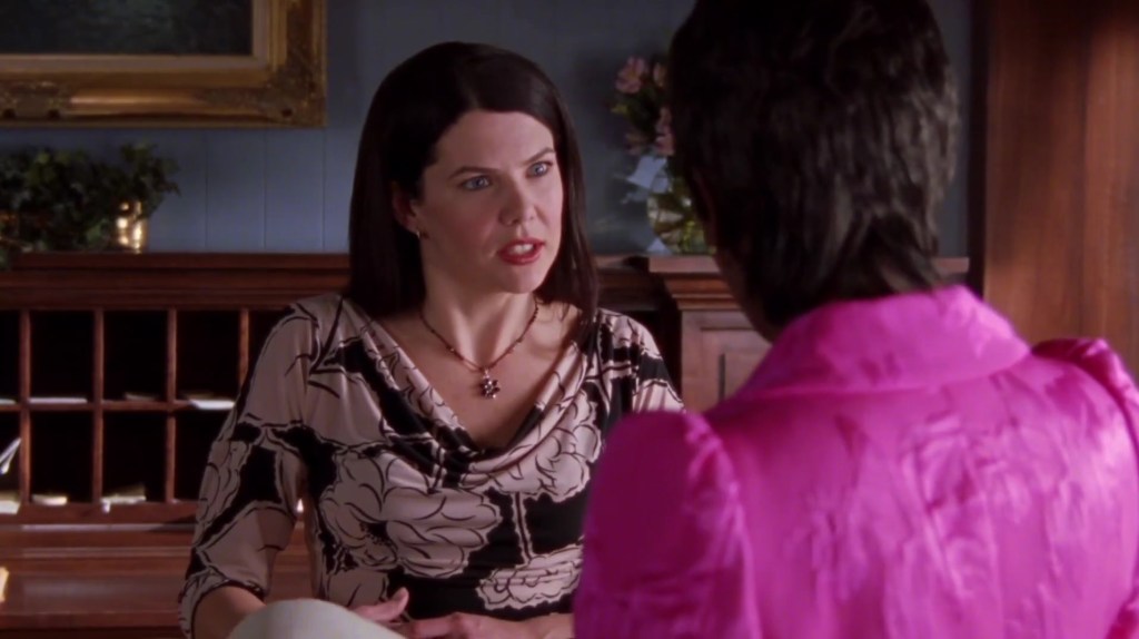 Michel and his mother Giselle are having a wonderful time together treating themselves to luxurious meals, and there must surely be some malice involved when Lorelai decides to “out” Michel as a fad dieter to his mother (it feels like a subtitute for a different kind of “outing”, and just as much of a betrayal).
