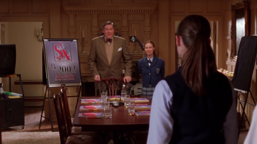 Rory is amazed that when she and the other students arrive at the Gilmore home in Hartford, Paris is already there, and greeting them as if it is her house. She and Richard clearly hit it off, and she seems to easily fit in with his plans and expectations, taking a prominent role as if she has indeed usurped Rory’s position as both group leader and granddaughter – although Richard is quick to remind everyone of Rory’s status.