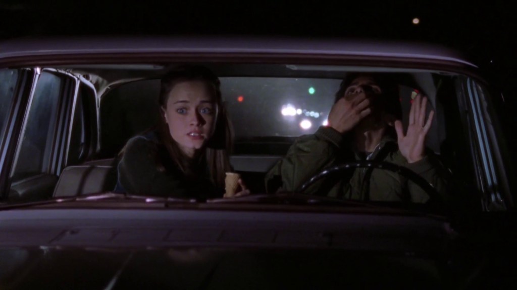 Out the back window, you can see a set of traffic lights, and multiple cars behind them. I think they are still supposed to be driving around Stars Hollow, which only has one traffic light, on the main square, and almost no traffic. It really doesn’t look like Stars Hollow!