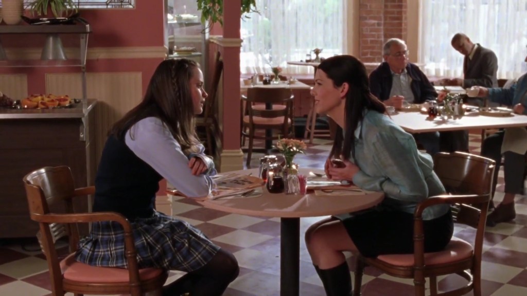 After his fight with Lorelai, and Jess going back to New York, Luke has closed the diner and gone fishing – something which has never happened before. Lorelai and Rory are forced to eat breakfast at a rival business we have not heard of until now called The Hungry Diner. The diner has a dark pink colour scheme, in contrast to the blue colour scheme of Luke’s Diner.