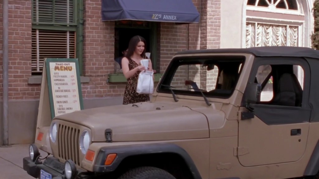 Before leaving for Hartford, Lorelai grabs a burger from a take-out place that is just a window in a wall, called KC’s Annex. It’s next to an art gallery that I don’t think we ever hear about. The burger is disgusting, according to Lorelai, and she is going to starve to death if Luke doesn’t get back soon (even though Stars Hollow has more food options than is economically plausible!).