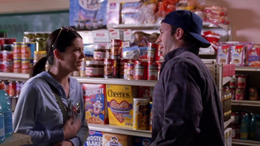 Note that Frosted Flakes breakfast cereal is shown in the background, which was so prominent in the scene where Lorelai discovers Jess will be moving to Stars Hollow.