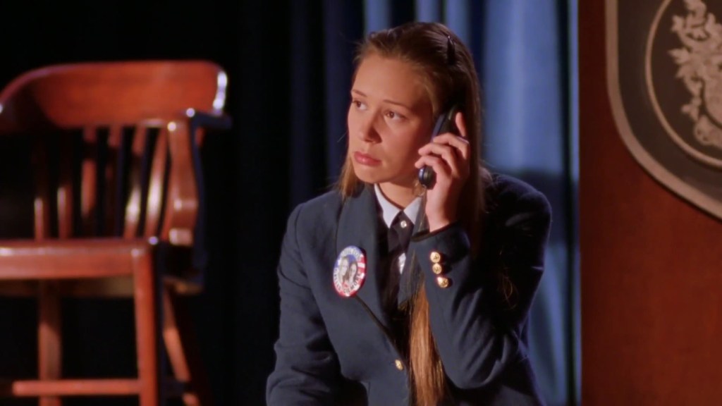 Note that Paris is wearing one of the 400 campaign buttons that Lorelai made for them, showing Rory’s and Paris’ faces, against what looks like the US flag (as if it’s a real presidential election, not just one for school).