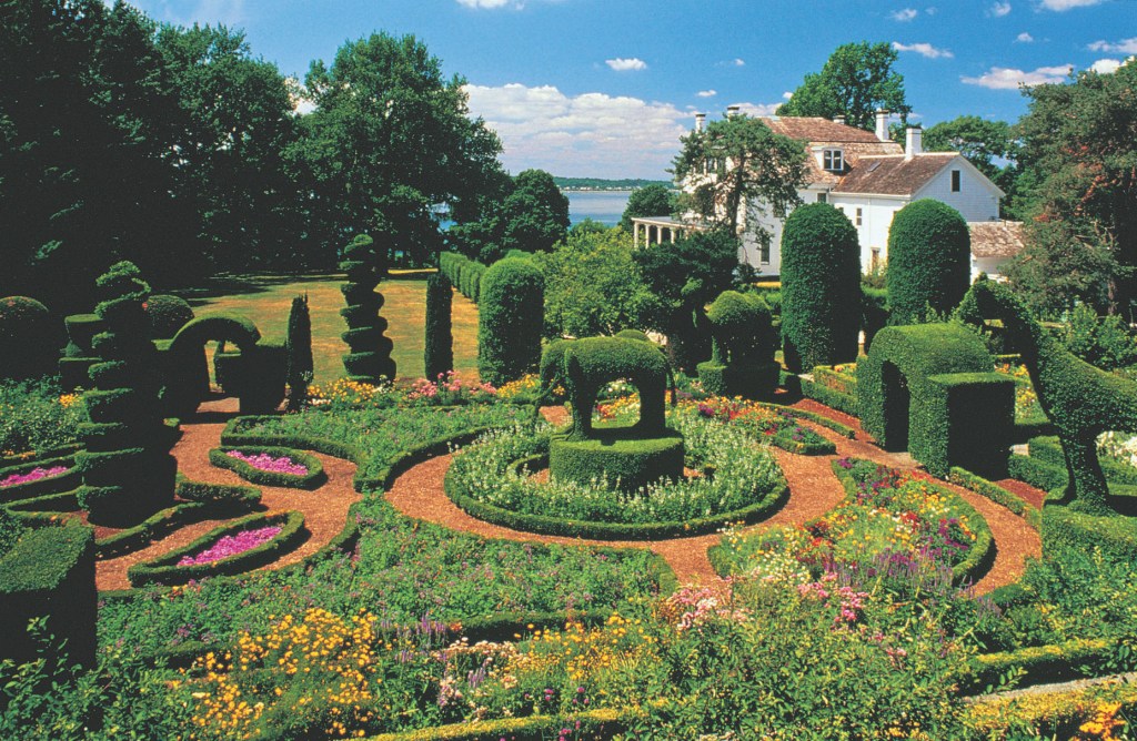 Topiary is the art of clipping evergreen trees and shrubs into clearly defined shapes as a part of landscaping grounds. Common plants used for topiary are box, conifers, laurel, holly, myrtle, yew, and privet. Topiary dates to ancient Roman times, declined in the 18th century, but was revived in the 19th, and became part of what we consider the “classic English garden”. The style was later adopted by wealthy upper-class Americans for their gardens. [Picture is a topiary garden in Newport, Rhode Island].