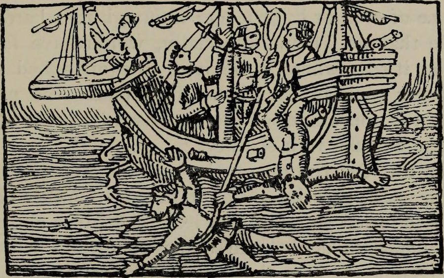 Keelhauling [pictured]: a form of punishment where the offending sailor was tied to a line looped beneath the vessel, thrown overboard on one side of the ship, and dragged under the ship’s keel, either from one side of the ship to the other, or the length of the ship. It could lead to death by drowning or head trauma, or result in permanent injury. It was an official, although rare, punishment in the Dutch navy. There are vague reports of it being used elsewhere, although there are no records of it.