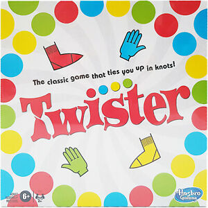 Twister, previously mentioned. A game of physical skill played on a large plastic mat which is spread on the floor. The mat has six rows of large coloured circles on it with a different colour in each row: red, yellow, green, and blue. A spinner tells players where they have to place their hand or foot. The game promotes itself as “the game that ties you up in knots”.