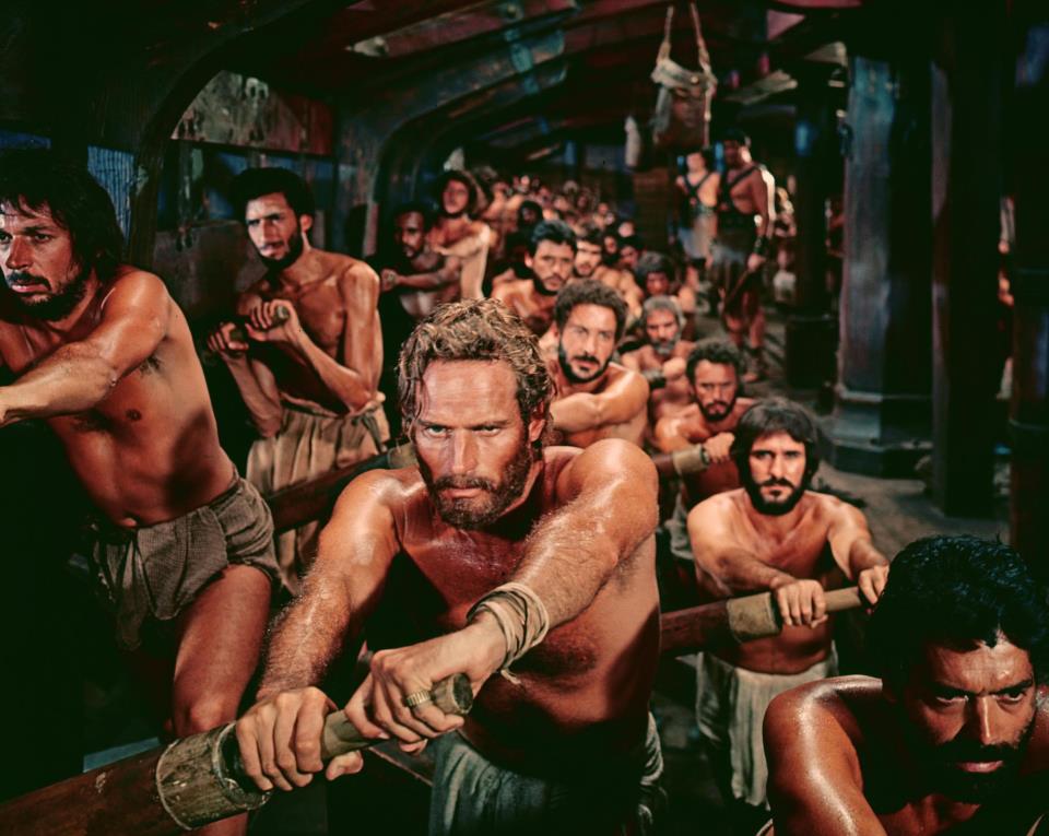 In the film, Ben-Hur is unfairly condemned to be a galley slave for three years, and in the famous galley scene, the slaves are shown working in time to the beat of a drum, and sometimes being whipped to make them work harder. Meanwhile the consul in charge simply sits back and watches them, apparently for sadistic pleasure, since there is no need for him to even be down there in the galley, which is dark and hot.