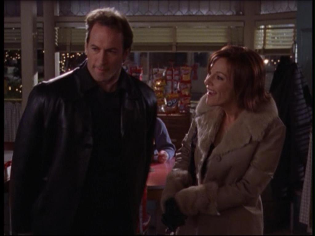 Lorelai is at Luke’s diner to get a coffee before she drives to Hartford to have dinner with her mother. Luke isn’t there when she gets in, and when he does appear, he’s clean-shaven and dressed up – even wearing clothes that Lorelai picked out for him.