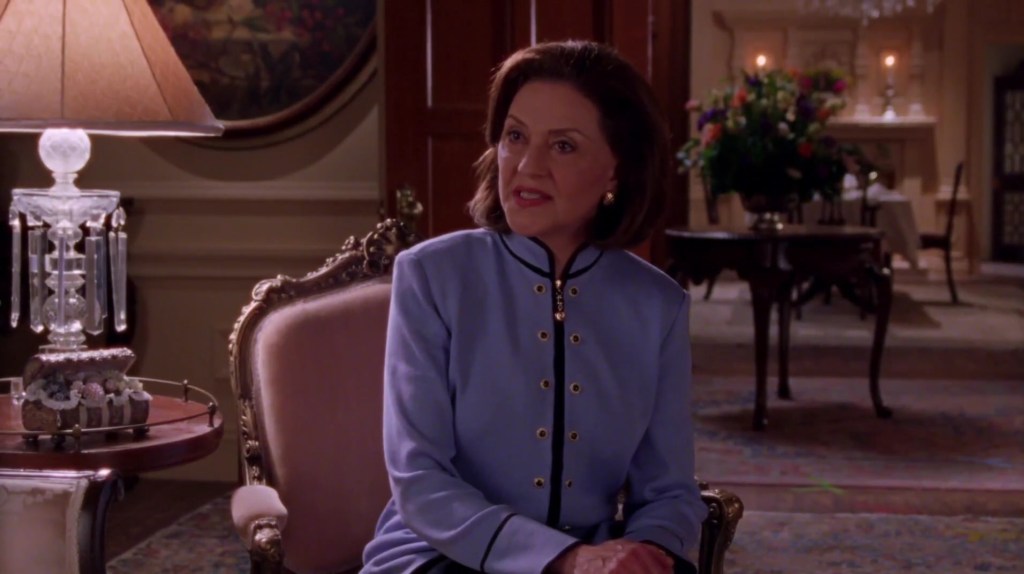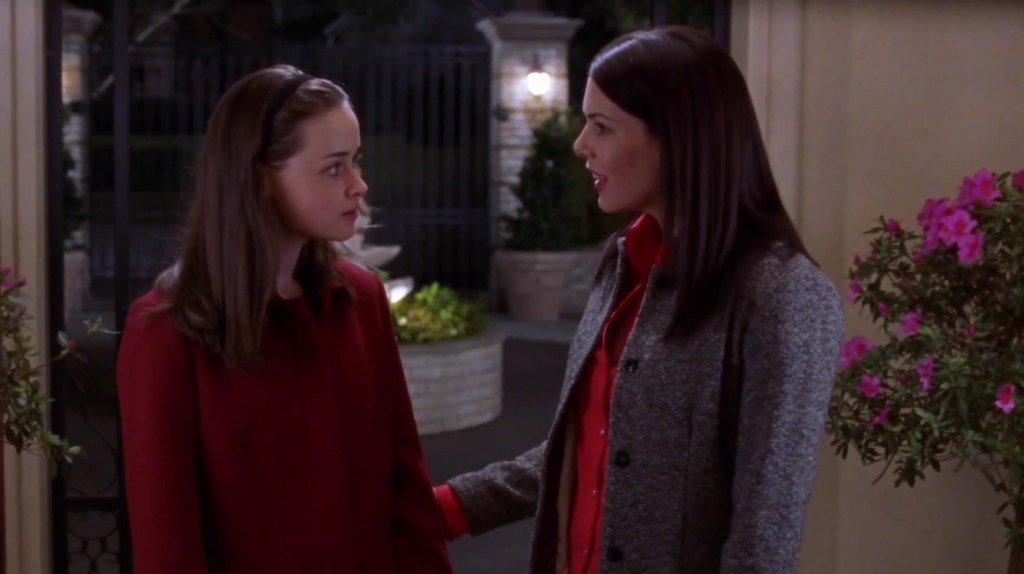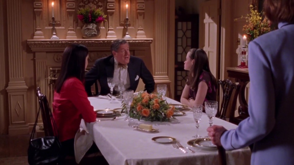 Lorelai suggests that Rory should call Dean back, as a tacit reward for his “good behaviour”, but Rory says she’ll call him the next day. She’s heading over to spend time with Lane, and they might even sneak out to Luke’s. Mrs Kim is away at an antiques fair, and Lane’s grandmother, who must be Mrs Kim senior, her father’s mother, is babysitting, but conveniently goes to bed at 6 pm – this might explain other times Lane has mysteriously been able to go out late at night, such as Madeline’s party.