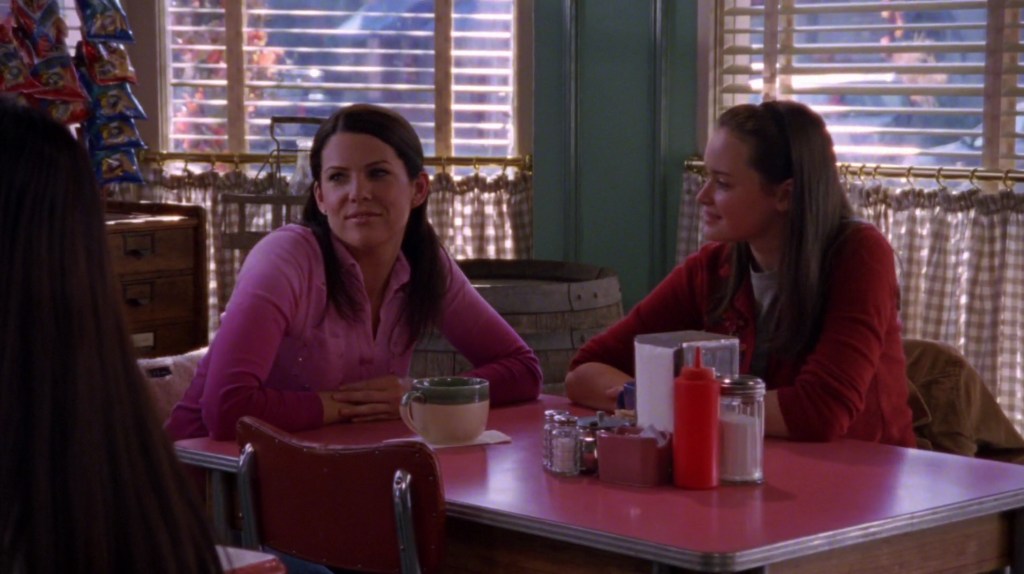 The show opens with Lorelai and Rory having a weekend breakfast at Luke’s and finding it disturbingly busier than they anticipated. (It actually doesn’t look busier than any other time they’ve shown Luke’s diner on a weekend at breakfast time).