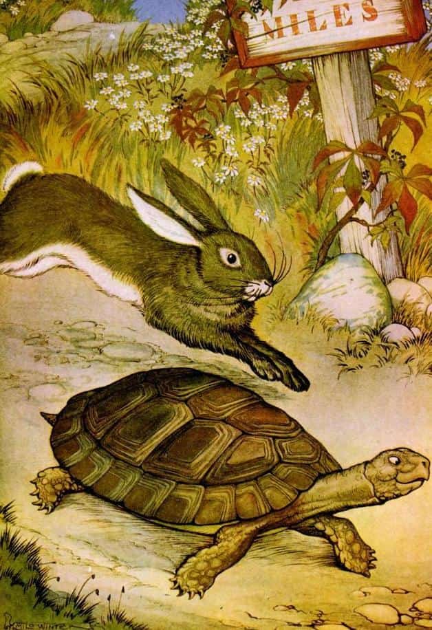 “Slow and steady wins the race” is a proverb from “The Tortoise and the Hare”, a story from Aesop’s Fables – a collection of tales from ancient Greece, attributed to a legendary slave named Aesop.