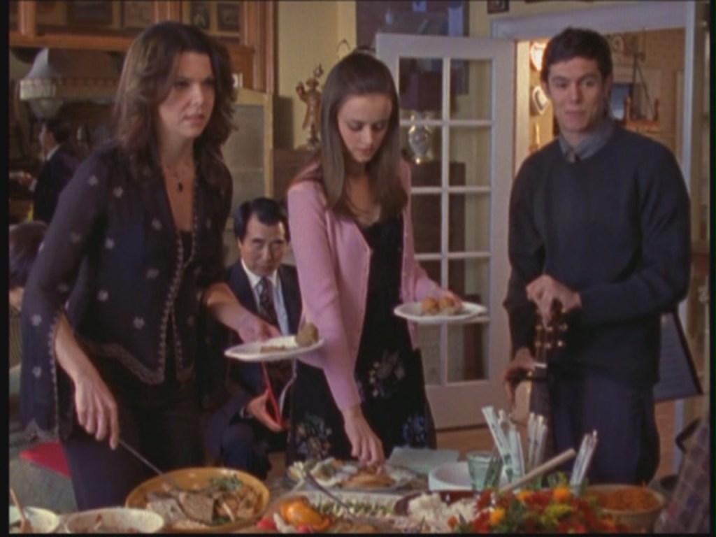 Lorelai and Rory notice that Dave is playing guitar at the Kim’s Thanksgiving dinner. Lane quickly explains that she has set up another zany scheme, whereby Dave came all the way to Stars Hollow at five in the morning in order to have a five minute conversation with Mrs Kim and eat faux egg sandwiches. Lane then put a fake ad up for Dave on their church bulletin board, and pretended to find it in front of her mother.