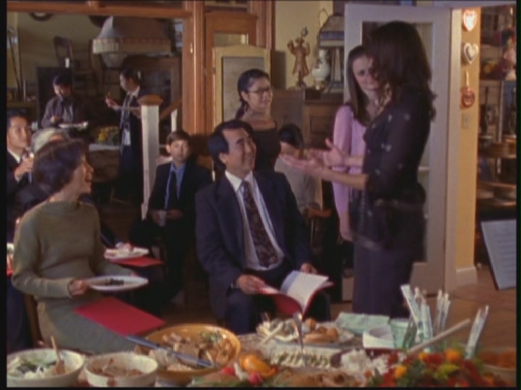 Notice how familiar Lorelai and Rory are with the Kim relatives, knowing their names, and comfortable enough to make polite small talk. They look genuinely happy to see Lorelai and Rory. Although we rarely see it, the Gilmore girls must often attend family gatherings at the Kim household.