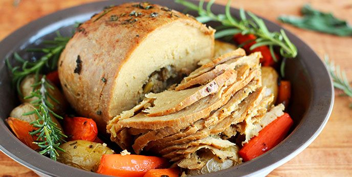 Tofurkey is a vegan meat substitute made from tofu and wheat protein, made into a loaf, filled with stuffing and flavoured with herbs and spices. As a brand name, Tofurky is made by Turtle Island Foods in Hood River, Oregon. It is stuffed with mushrooms and wild rice, and has been available since 1995.