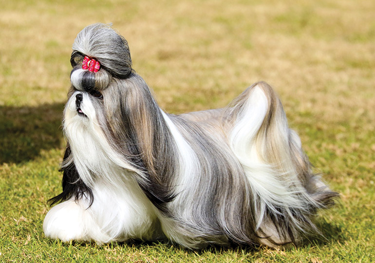 A shih tzu is a breed of toy dog originating from Tibet. They have a short snout, large round eyes, long coat, floppy ears, and a playful, friendly disposition. Their name translates to “lion” in Mandarin, and the breed is considered sacred in Buddhist mythology.