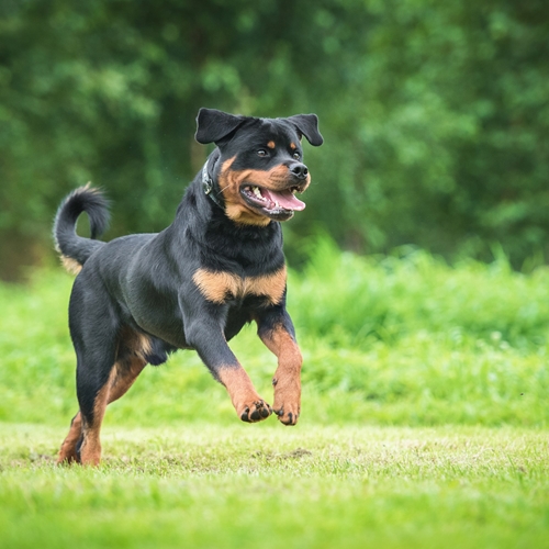 Rottweiler, a large powerful breed of dog which is one of the oldest surviving dog breeds in the world, going back to ancient Roman times. The name comes from the German city of Rottweil, where the original breed interbred with native dogs to produce the modern breed we know today.
